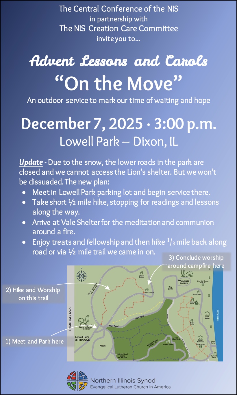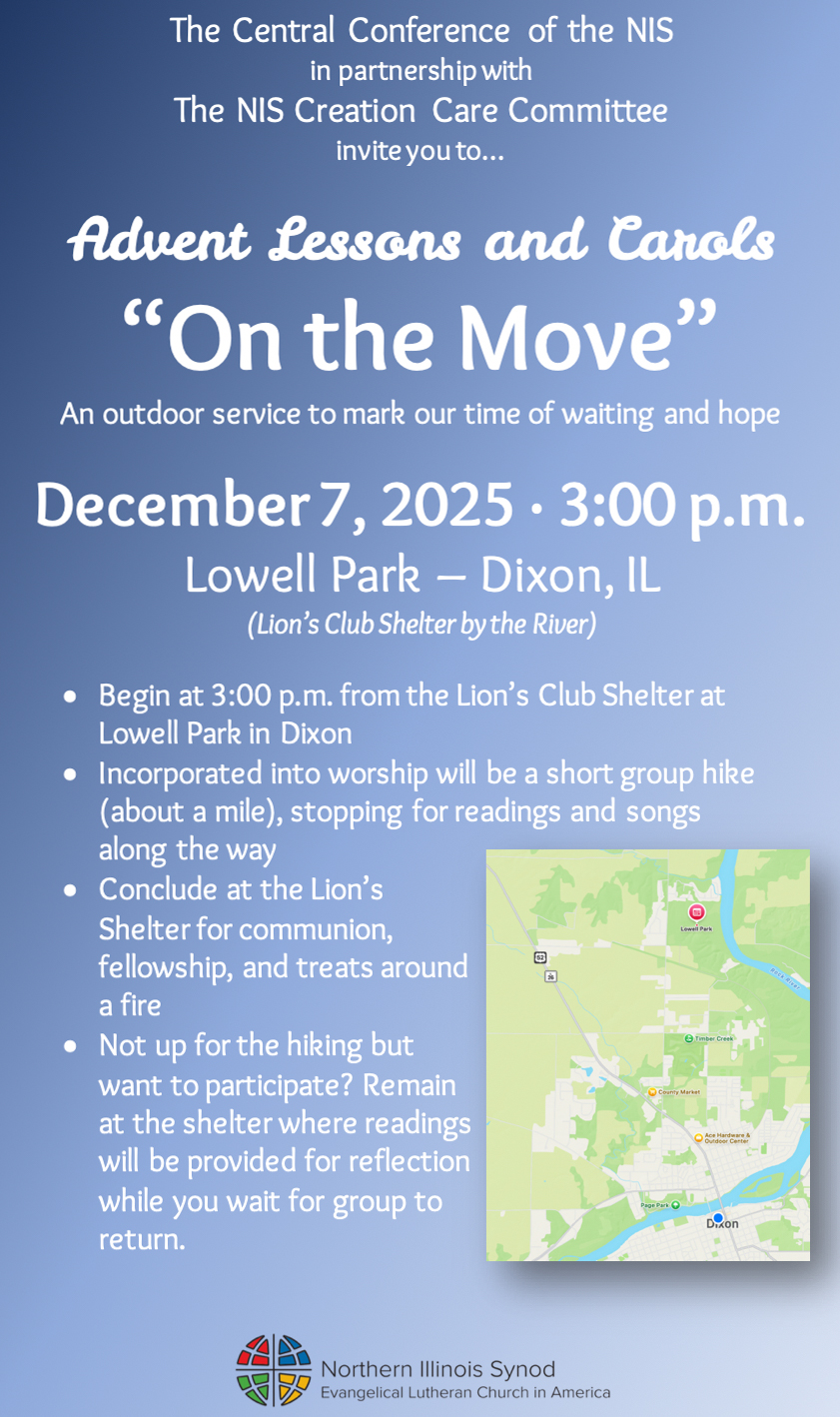 You are invited to join the Northern Illinois Synod Central Conference and the Creation Care Subcommittee for an Advent Lesson and Carols "On the Move."