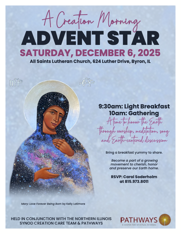 You are invited to join Carol Soderholm, members of the Creation Care Subcommittee, and Pathways: A Center for Spiritual Renewal for an Advent Earth Church on Saturday, December 6th, at 9:30 am at All Saints Lutheran Church in Byron, IL.