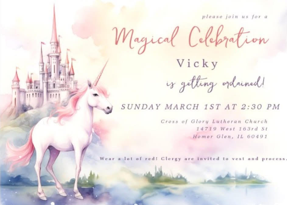 You are invited to a worship service with the Rite of Ordination and Installation on March 1, 2026 at Cross of Glory Lutheran Church in Homer Glen, IL.