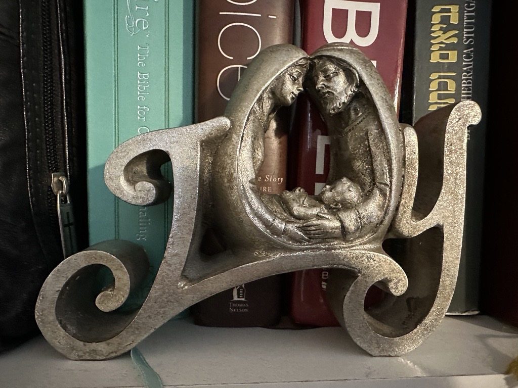 And then I noticed this one on my bookshelf. This one is dear to me because it was a gift during my year of internship in North Carolina. I love how beautifully simple this is. It only shows Joseph, Mary, and Jesus in a quiet moment as a new family. There is so much love found here. And it creates the word, “Joy.” This is what the birth of Jesus is all about.