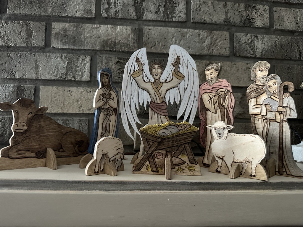 With this version of the Christmas story in mind, I looked through all of my nativities to see if I had one that depicted the Christmas narrative according to Matthew chapter 1. I have this one that I commissioned from a woodworking friend. I intentionally asked for him to create pieces with darker skin to be more historically accurate. Not being a Christian himself, he didn’t have the baggage of traditional nativities. I love that he decided to make the shepherds both male and female. Even so, clearly this one depicts Luke’s narrative. There are sheep and shepherds, and Jesus is in a manger.
