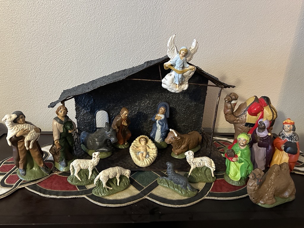 Many years ago, when I lived in LeClaire Iowa, I purchased the nativity set pictured here from a secondhand shop. My spouse and I love how quirky it is. It looks like it may have been hand-painted (or at least touched up by hand) because some of the eyes don’t stay in the lines. One of the camels has clearly had his head broken off and glued back on. Also, baby Jesus is huge in comparison to the other figures. This set was clearly well-loved by its original household, and my husband and I love it now, too.